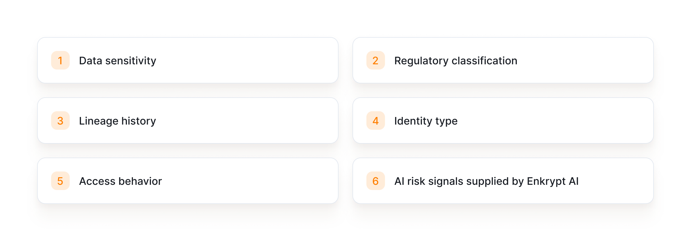 Access decisions must reflect the live intersection of AI workload posture, data sensitivity, lineage, identity context, and observed access behavior. Policies cannot rely solely on conditions that existed when they were originally written.