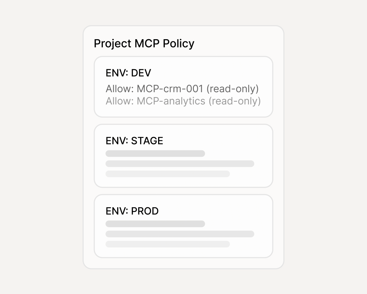 Per-project, per-environment MCP policies — dev, stage, and prod each get exactly the tools they need.