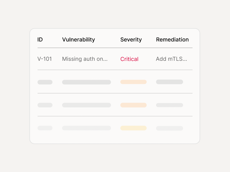 Vulnerability findings with severity, proof-of-concept, and remediation guidance for every scanned MCP server.